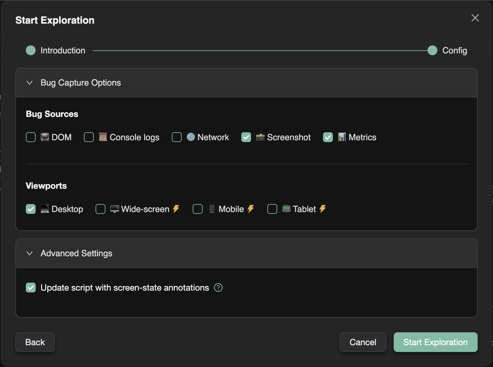 - Advanced settings (test creation config, target screen-state config, update screen-state annotations)