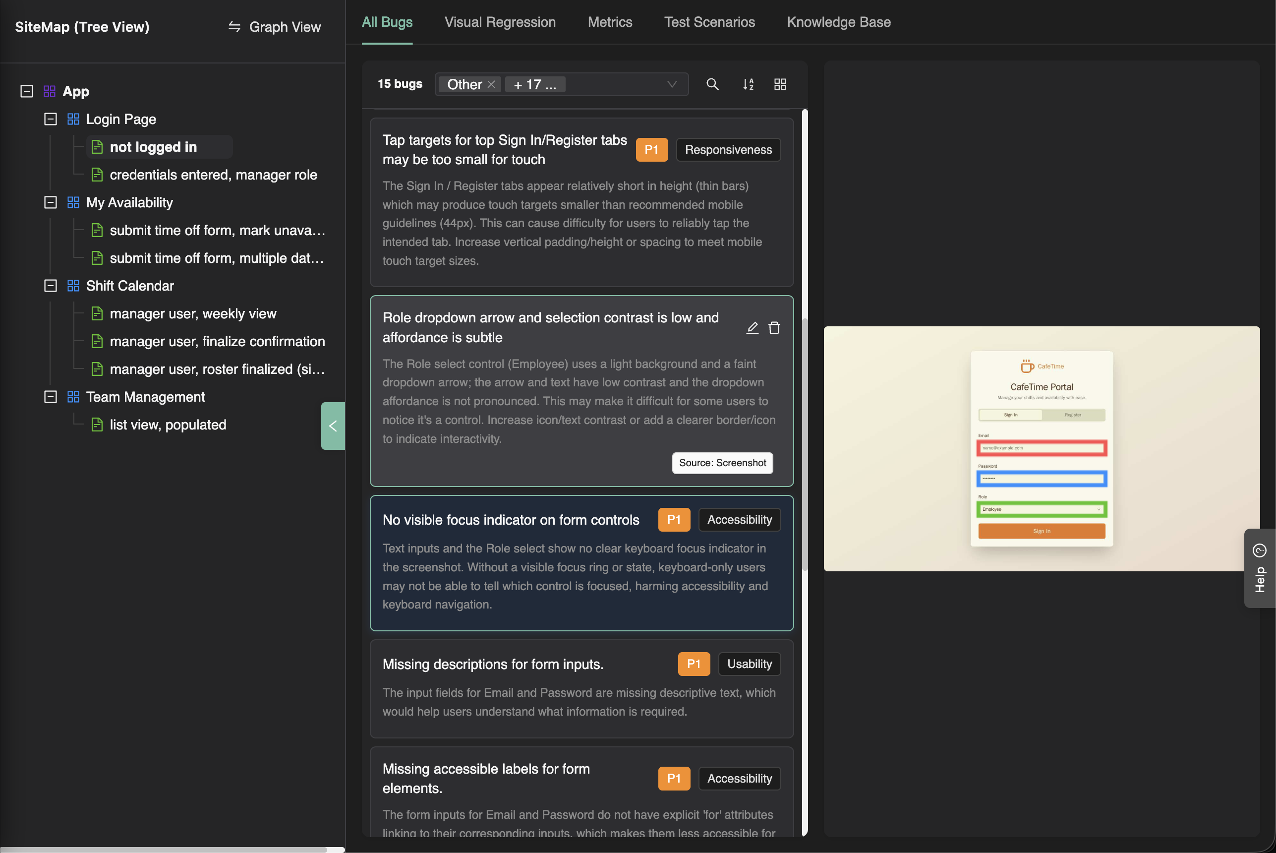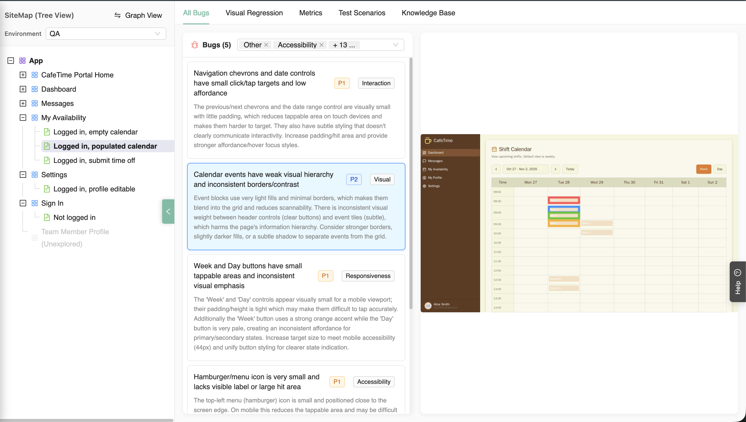 Bugs are tagged at the specific screen-state where they were identified, providing contextual understanding of where issues occur. All bugs can be viewed in the Atlas SiteMap.
